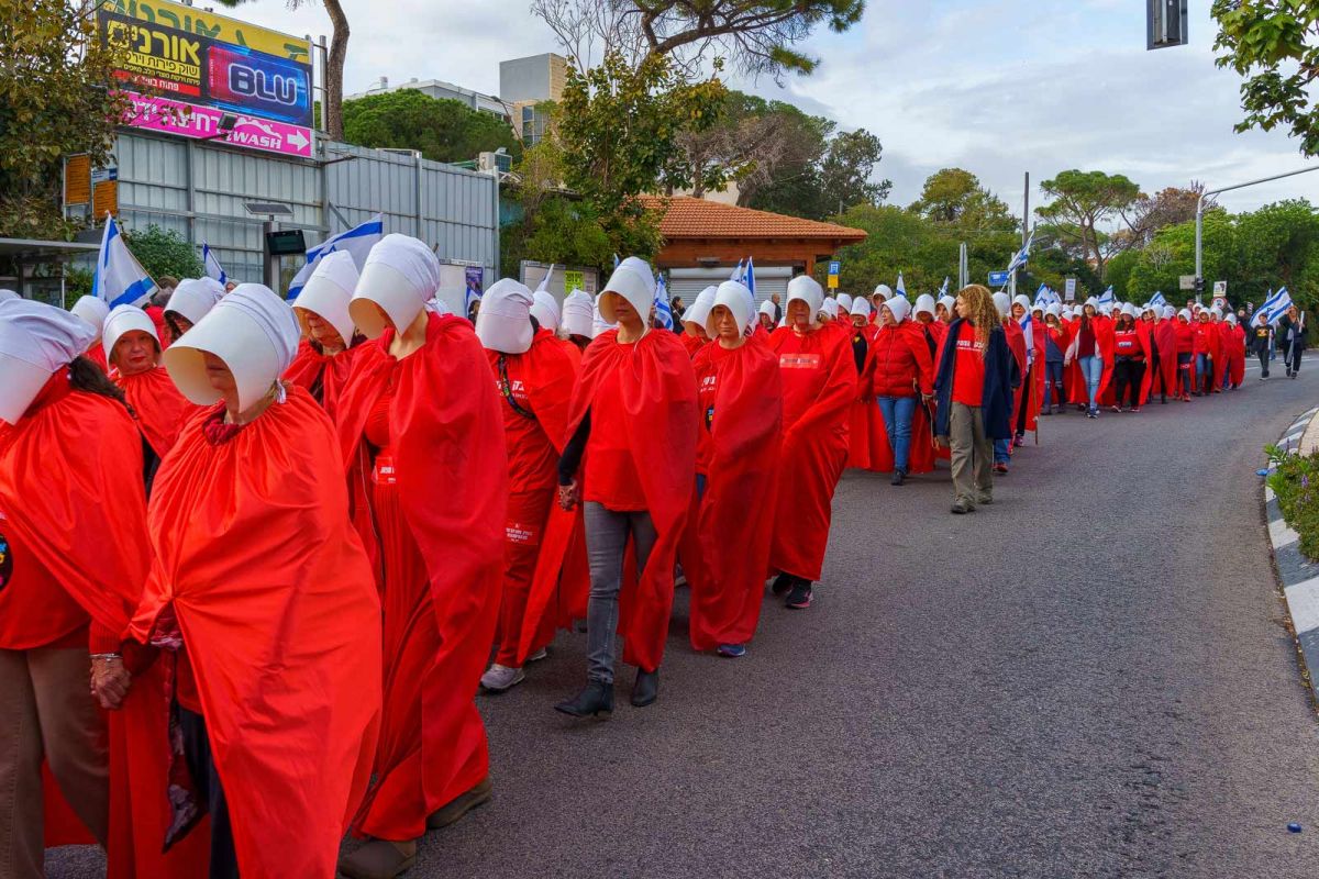 Z fali protestów w Izraelu docierają obrazy protestujących w czerwono-krwistych pelerynach i białych czepcach z kornie schyloną głową. To przywołanie archetypicznych bohaterek z telewizyjnego serialu Opowieść podręcznej (The Handmaid’s Tale), opartego na powieści Kanadyjki Margaret Atwood z 1985 roku o tym samym tytule.