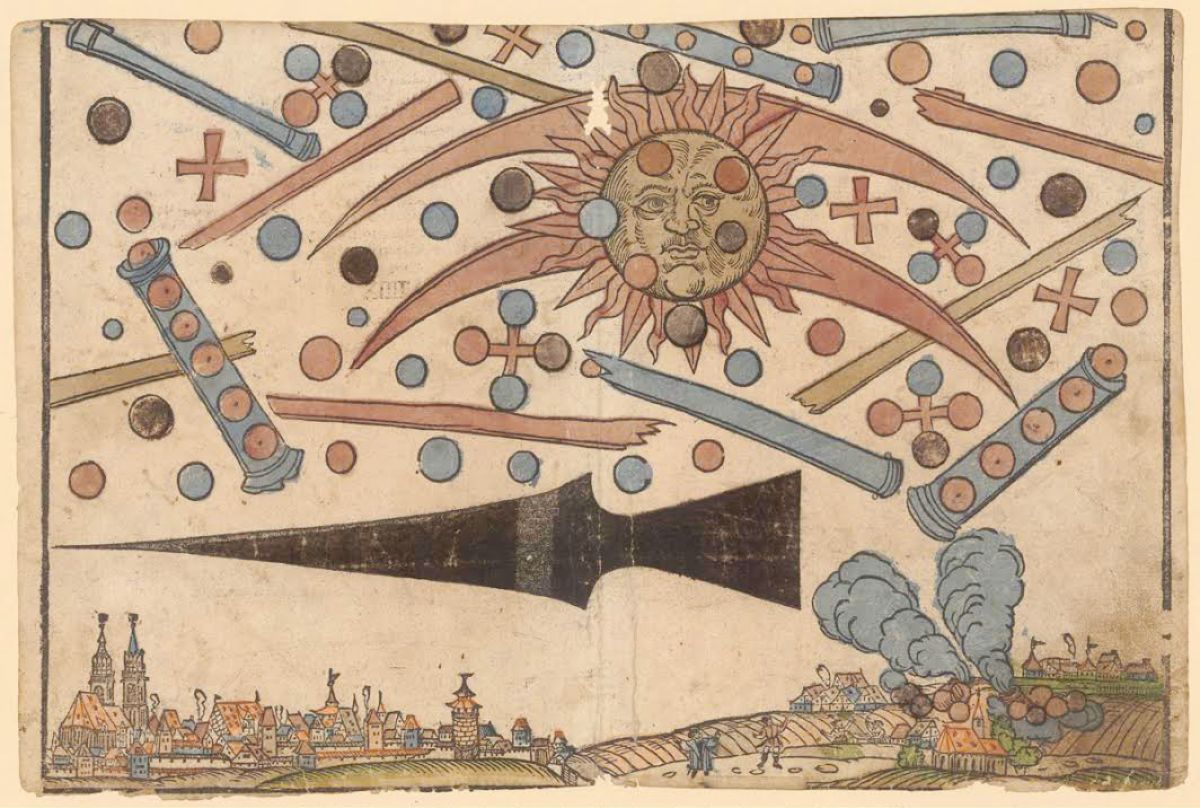 Psychiatra, Otto Billing, poszedł dalej, zasugerował, że drzeworyt symbolizuje powszechne zamieszki w Europie z perspektywy historycznej. Według niego Norymberga była zamożnym, półautonomicznym miastem w Świętym Cesarstwie Rzymskim, które podczas Reformacji próbowało zachować neutralność w konfliktach między katolikami, a protestantami. Mimo deklarowanej neutralności miasto było narażone na ataki i oblężenia. Doprowadziło to do wzrostu podatków na odbudowę, budowę fortyfikacji i niepokojów społecznych. To pociągnęło za sobą objawienia, których treść zachowała się w zapiskach. Jeden z nich mówi, o wielu słońcach, które pojawiły się po ataku na miasto w Wielki Piątek 1554r., inny z lipca tegoż roku wspomina rycerzy z ognistymi mieczami walczących na niebie. Billig twierdzi, że podobne objawienia pojawiły się również w czasie wojny trzydziestoletniej i uważa, że wizje te były prawdopodobnie spowodowane cierpieniem i apokaliptycznymi przeżyciami wojennymi. Sugestia Billinga, dotycząca perspektywy historycznej, może mieć jakiś związek z błędami na drzeworycie. Jednym z nich jest brak zamku cesarskiego, który w czasach Glasera był już symbolem Norymbergi.