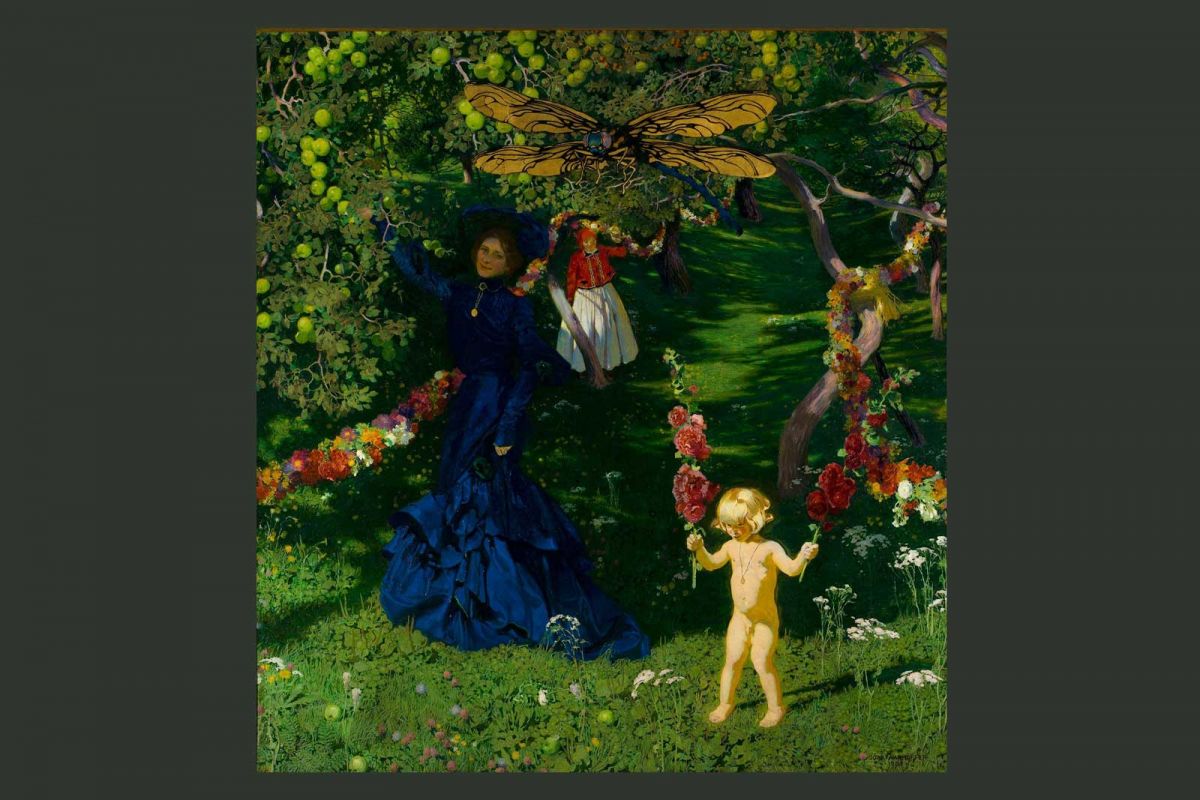 Spójrzmy na obraz. Lato w pełni: wakacje pośród obfitych darów natury. Życie w rozkwicie: piękna żona, upragniony – i jedyny – syn, uosobienie witalności i niewinności, do tego uginające się od owoców konary jabłoni i kwiaty mieniące się feerią barw. Wiejska sielanka: dobrze sytuowana rodzina krakowskiego artysty, której towarzyszy ludowa piastunka do dziecka, podczas spaceru po sadzie zażywa kąpieli słonecznych... Tę idyllę burzy monstrualnych rozmiarów ważka usytuowana nad głowami głównych postaci – co prawda, oddana z dużą dokładnością, lecz jej nienaturalna wielkość zakłóca kompozycję dzieła, a w widzach budzi niepokój. Napięcie się wzmaga, gdy uświadomimy sobie, że żadna z postaci utrwalonych na płótnie zdaje się nie dostrzegać gigantycznego owada.