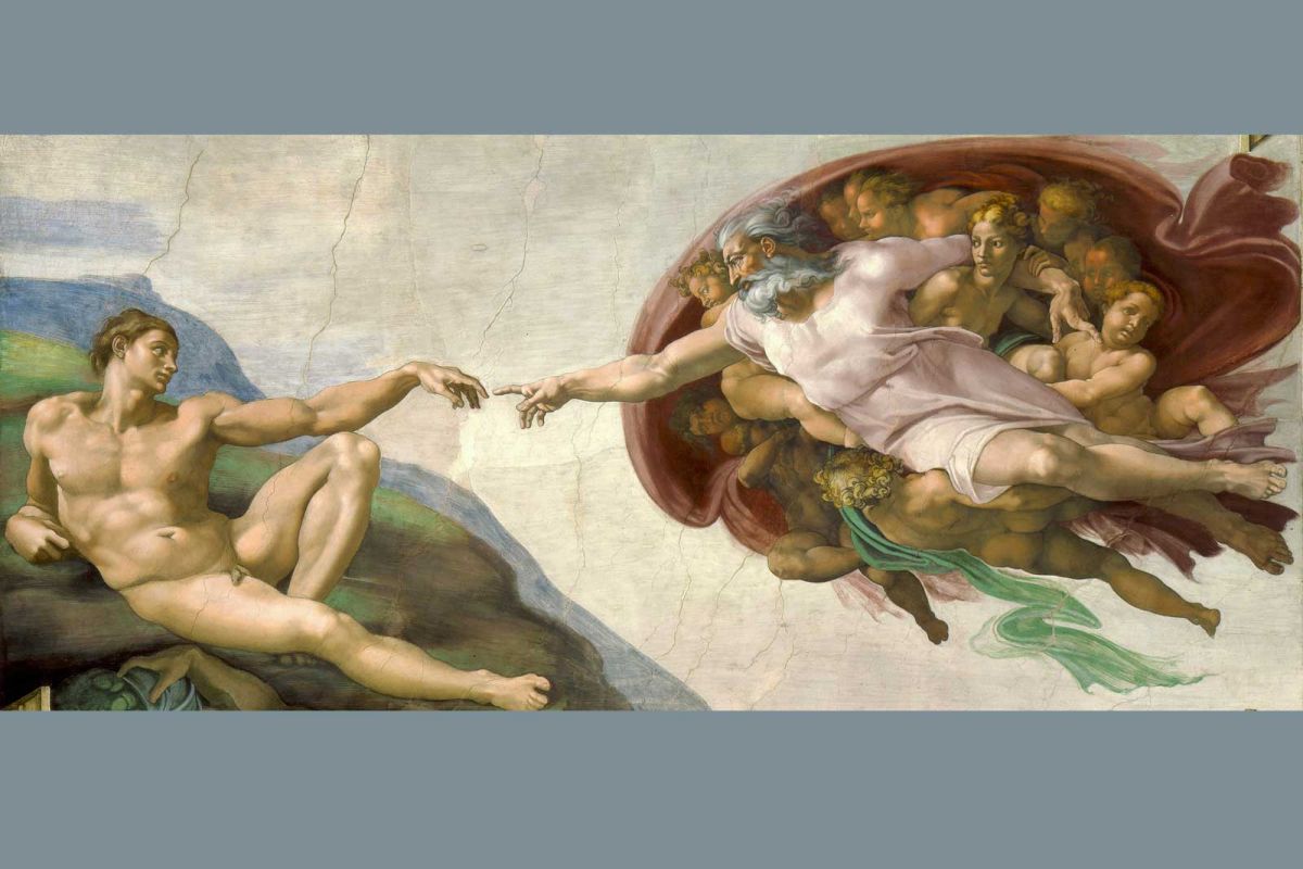 Michał Anioł wypełnił piękne i proporcjonalne ludzkie ciało mięśniami wysportowanego atlety. A przecież jego Adam, ten pierwszy mężczyzna, wciąż ma rozmarzone spojrzenie i dopiero zaczyna się poruszać, ledwie wyciąga ramię w stronę nadlatującego Stwórcy. Co ważne, Michał Anioł nie zasłonił niczym genitaliów Adama, podobnie zresztą uczynił w przypadku wielu innych męskich aktów na tym monumentalnym fresku. Artysta ukazał Adama jako młodego mężczyznę, przystojnego i szlachetnego niczym sam Bóg. Ten ostatni, posturą przypominający posągi Zeusa, nie unosi się wysoko ponad Adamem, ale znajduje się prawie na tej samej wysokości – tym samym Stwórca nie został przez artystę wywyższony, a Jego wyraźnie widoczna twarz emanuje troskliwością ojca, nie jest więc obliczem gniewnego Boga ze Starego Testamentu.