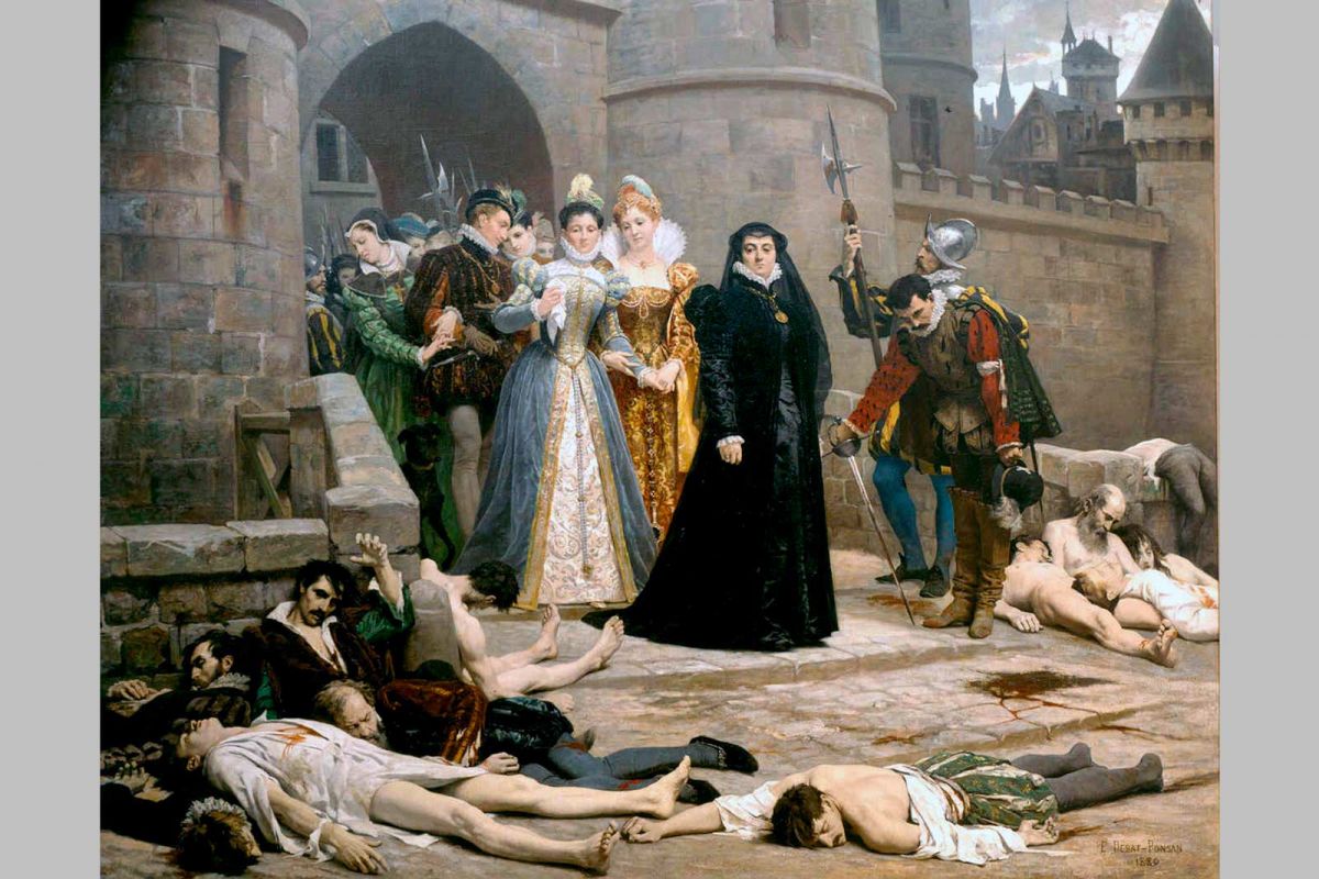 W noc św. Bartłomieja stolica Francji spłynęła krwią. Przed bramą Luwru, na płótnie Édouarda B. Debat-Ponsana, na pierwszym planie widzimy Katarzynę Medycejską, całą w czerni, z wyrazem pogardy – a może też niepokoju o przyszłość – spoglądającą na bezładnie leżące ciała pomordowanych hugenotów. Część innowierców nawet nie zdążyła się przyodziać, gdy nocą wywlekano ich z łóżek. Za Katarzyną najprawdopodobniej stoi Margot wspierana przez jedną z dwórek. W prawej dłoni trzyma chusteczkę, co może symbolizować jej smutek po bestialskiej rzezi. Jedna z kobiet wyraźnie odwraca głowę, by nie patrzeć na zbroczonych krwią hugenotów. Towarzyszy jej dworzanin, który w prawej ręce trzyma sztylet – broń skrytobójców. W głębi oraz po prawej widać gwardię szwajcarską – halabardników, którzy w nocy mordowali „heretyków”.