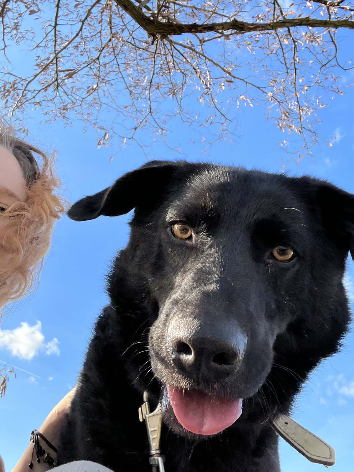 Pierwszy spacer z Cywilem. Nie jest mną zainteresowany, energicznie ciągnie do przodu, w stronę łąki. “Cywil…? Nie zjesz mnie, prawda?”, pytam. “Fajnie by było, gdybyś mnie jednak nie zjadł, mogłabym cię wtedy jeszcze zabrać na dużo spacerków… A jak mnie zjesz, to zjedzona cię nie zabiorę. Szkoda by było”. Cywil dalej wydaje się być niewzruszony moją obecnością i beztrosko drepta do przodu, obwąchując kępki trawy po drodze. Kiedy się zatrzymuje, z gracją, delikatnie, podnosi przednią łapkę do góry. Widać jego czarne, miękkie opuszki. Już nie szczeka, porusza się cicho, przestaje ciągnąć, całe jego narwanie z boksu wydaje się zanikać. Idziemy dalej przed siebie, na pierwszy z wielu, jak się później okazuje, spacerów. Idę z pewnym dystansem, oddalona na długość smyczy, bo powiedziano mi, żeby go nie głaskać, zanim mnie lepiej nie pozna. Jeszcze będziemy leżeć razem na tej łące, biegać za patykami, a ja będę przychodzić do niego w dni, w które miałam nie mieć czasu, żeby tylko wziąć go na spacer, ale najpierw musi się narodzić taka piękna rzecz, zaufanie.